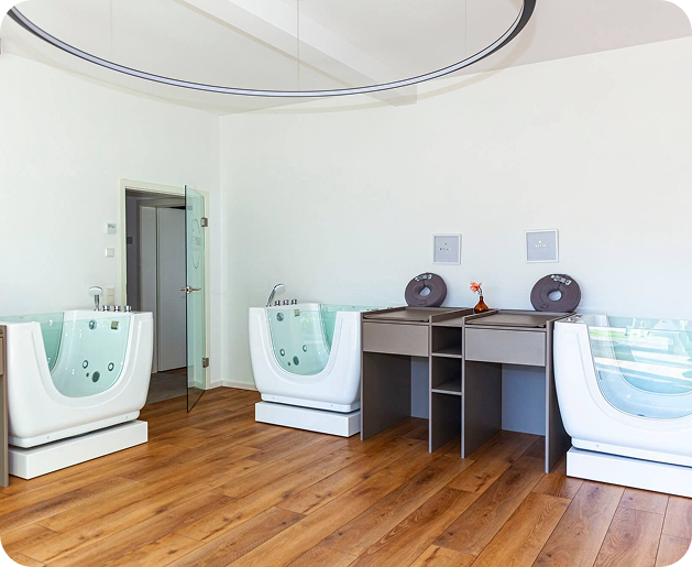 Unser Babyspa bietet eine beruhigende Umgebung, in der Ihr Baby in sanften Wassermassagen entspannen kann.